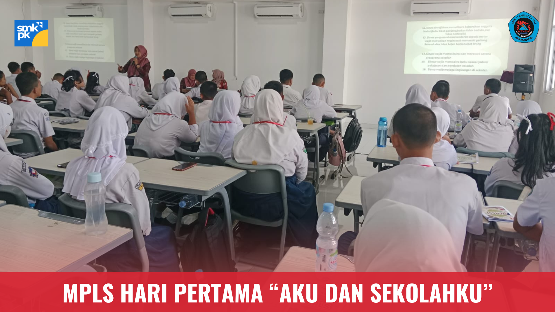 Materi “Aku dan Sekolahku” & “Aku dan Sekitarku” Sesi materi dimulai pukul 09.00 WIB dengan “Aku dan Sekolahku” yang diisi oleh Tim BK SMK 17 Agustus 1945 Semarang. Materi ini berfokus pada hak, kewajiban, sanksi, dan poin tata tertib, sekaligus pembagian surat pernyataan kepatuhan. Selanjutnya, “Aku dan Sekitarku” pukul 10.00 WIB mengajak siswa untuk mengidentifikasi fasilitas dan lingkungan sekitar pendidikan guna mengetahui layanan akses dan akomodasi pembelajaran. Pentingnya pemahaman ini ditekankan oleh salah satu pemateri: “Memahami lingkungan sekitar adalah langkah awal untuk merasa nyaman dan optimal dalam belajar”. Hari pertama ditutup dengan Technical Meeting untuk persiapan MPLS hari berikutnya, memastikan kelancaran seluruh rangkaian acara.