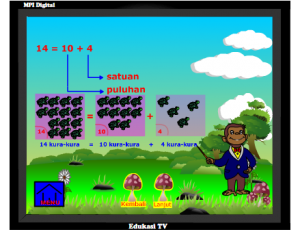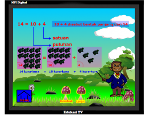 Halaman kedua dan selanjutnya terdapat animasi gerakan Mathis bergerak layaknya guru yang sedang menjelaskan suatu materi dan gambar kura-kura yang digunakan untuk mempresentasikan jumlah bilangan yang dijelaskan yaitu 14=10+4. Hal ini bertujuan agar bilangan yang disebutkan mudah dipahami siswa karena jumlah bilangan disesuaikan dengan jumlah kura-kura sehingga bilangan tidak lagi berwujud abstrak. Pada halaman tiga terdapat garis panah yang menunjuk jumlah angka yang mempunyai nilai satuan dan puluhan. Halaman empat menjelaskan nilai tempat bilangan 14 yaitu 10+4 disebut bentuk panjang dari 14.